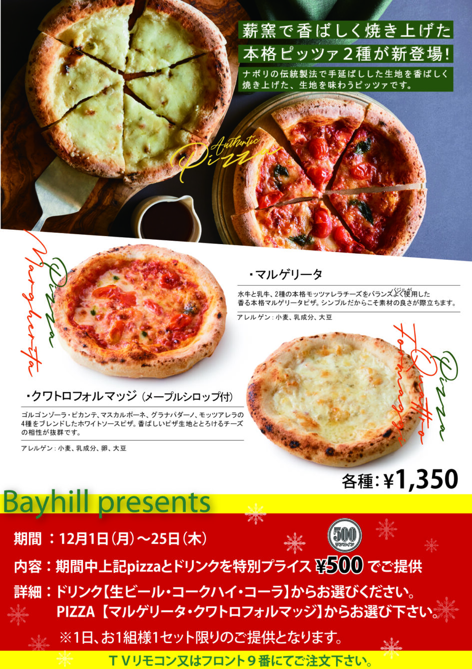薪窯で香ばしく焼き上げた本格PIZZA。12月1日~25日までクリスマス特別価格でご提供致します。ぜひお楽しみください。