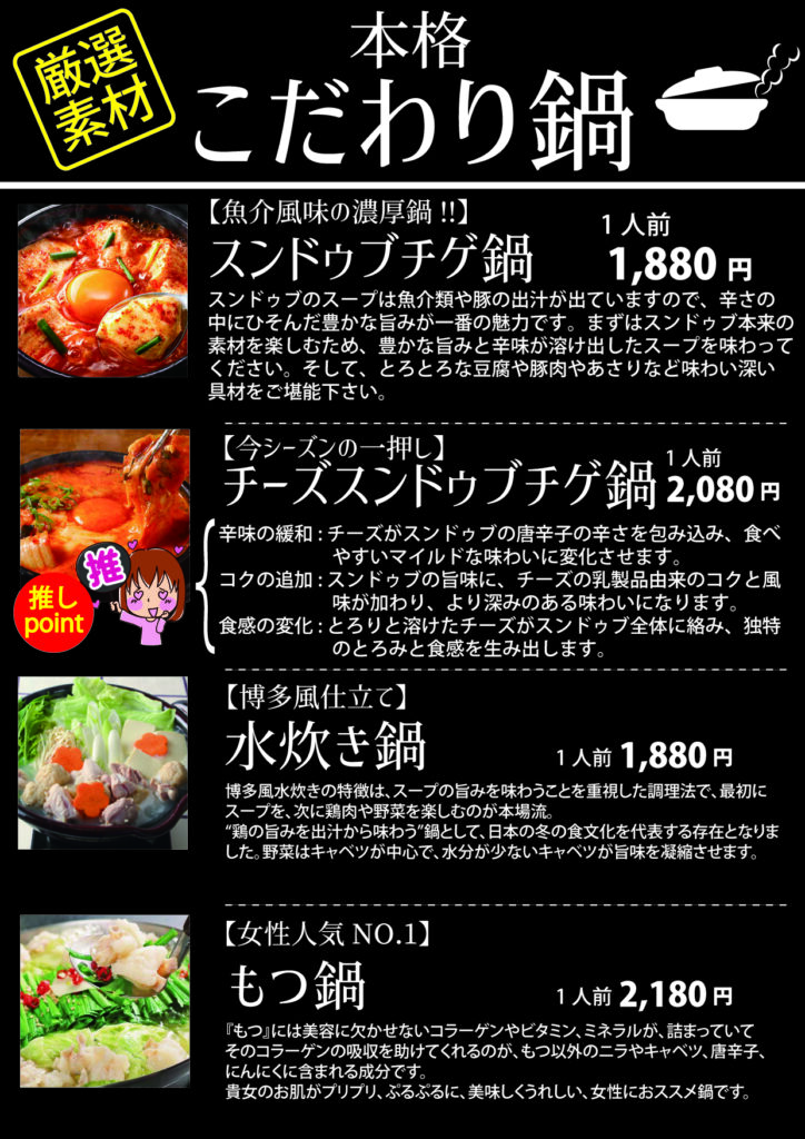 恒例の厳選!!鍋メニューがスタート。今年の推しはチーズスンドゥブチゲ鍋♡辛さと旨味が凝縮されたスープに更にチーズのマイルドなコクがより深みのある味わいに寒い日にぴったり!是非ご賞味ください。