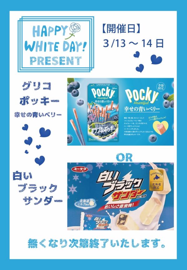 期間中、グリコポッキー幸せの青いベリーor白いブラックサンダーをプレゼント!なく… Continue Reading →